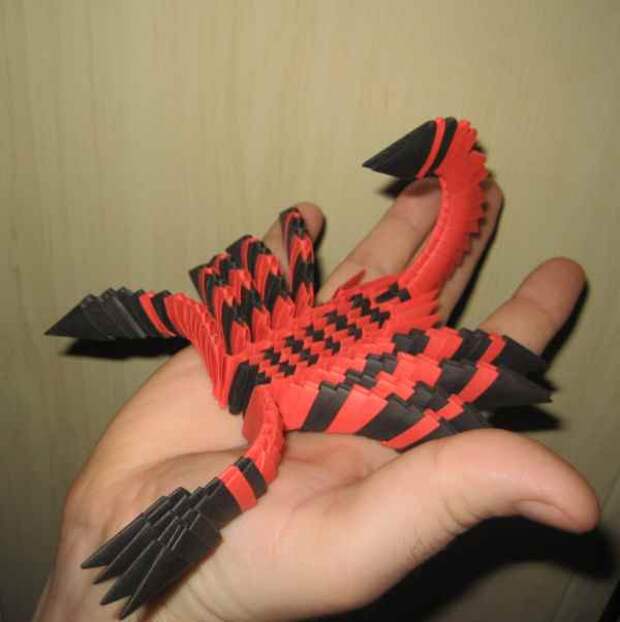 Модульное оригами собрано из бумаги двух цветов: красного и чёрного. Всего понадобилось 95 красных и 76 черных треугольных модулей.