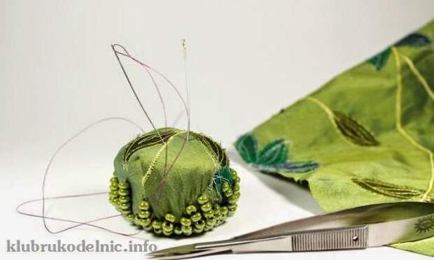 7. Так как ткань плотная, трудно сделать красивый круглый шарик. Это нестрашно, грубые складки закроем бусинами. Они, к тому же обеспечат игольнице устойчивость.