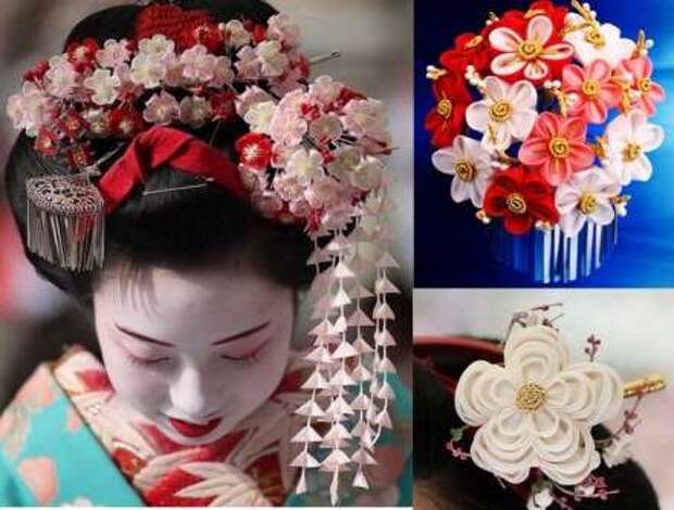 Родоначальниками данного художества числятся гейши (перевод слова «гейша» с японского «человек искусства»). Именно они 400 лет назад ввели в моду складывать волосы в необычные формы. Чтобы стрижки «держались», требовались различные шпильки, гребни и палочки. А так как одним из неприменных занятий в школе гейш было рукоделие, их заколки постоянно были декорированы очень мастерски.